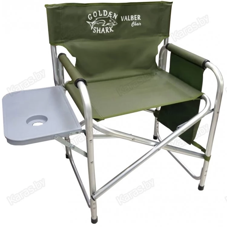 Стул с подлокотниками, откидным столиком и навесной сумкой.