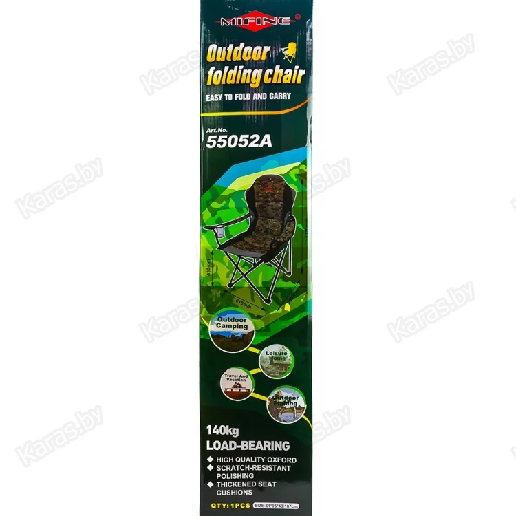 Складное туристическое кресло Mifine 55052А простая и надежная конструкция, функционирует по принципу зонтика. В транспортном положении данная модель практически не занимает место и имеет цилиндрическую форму, однако, будучи разложенным, превращается в полноценное кресло, с устойчивыми ножками, комфортной спинкой и подлокотниками. Небольшой вес. Одна из наиболее важных характеристик для путешественников, решивших купить туристическое кресло, цена. Эргономичные подлокотники, обеспечивающие правильную посадку. В одном из них предусмотрено отверстие под бутылку. Качественная обивка кресла, отличающаяся повышенной прочностью и износостойкостью и не боящаяся интенсивной эксплуатации.