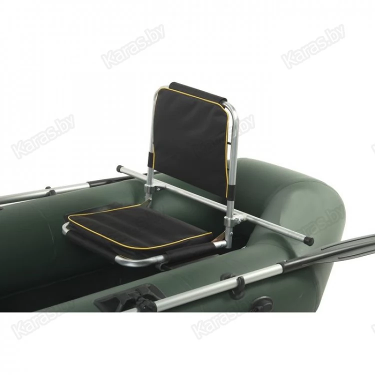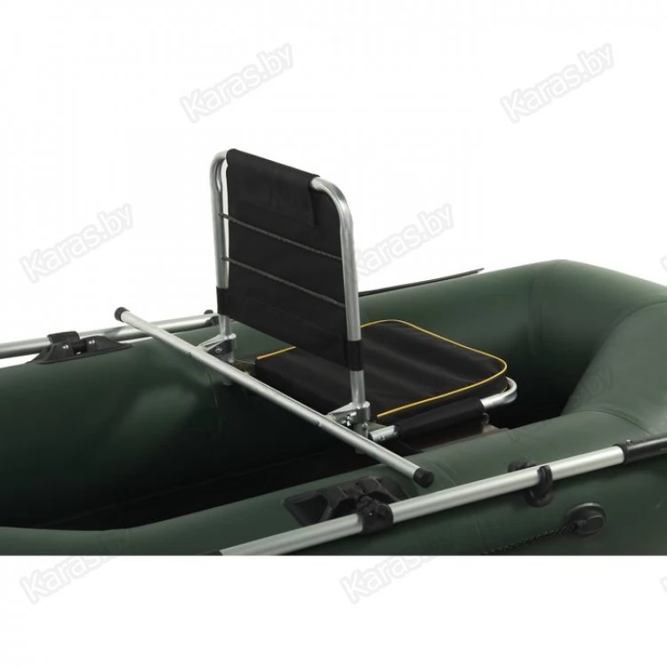 Данная модель оснащена задней опорой, которую можно регулировать по высоте. Благодаря ей кресло надёжно фиксируется поверх баллонов лодки и не качается.