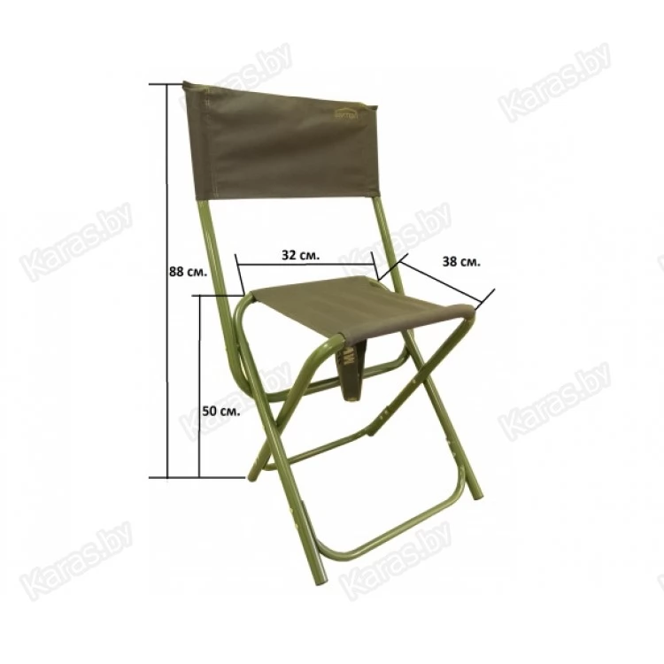 Стул складной изготовлен из стальной трубы 25 мм, покрыт порошковой краской. Ткань - плотностью 600 D, в два сложения. Нагрузка - до 200 кг. Вес - 2,9 кг.
