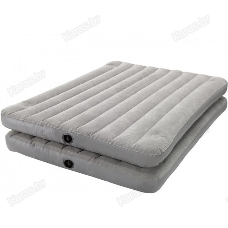 Отличная модель для тех, кому нравятся кровати – трансформеры. Эта надувная кровать Интекс имеет четыре специальных застежки, благодаря которым она из высокой двуспальной кровати быстро превращается в два низких двуспальных матраса. Надувная кровать Интекс состоит из двух матрасов высотой 23 см, соединенных по углам пластиковыми застежками-карабинами. Внутреннее пространство как верхнего так и нижнего матраса занимают продольные перегородки, обуславливающие волнистую поверхность.