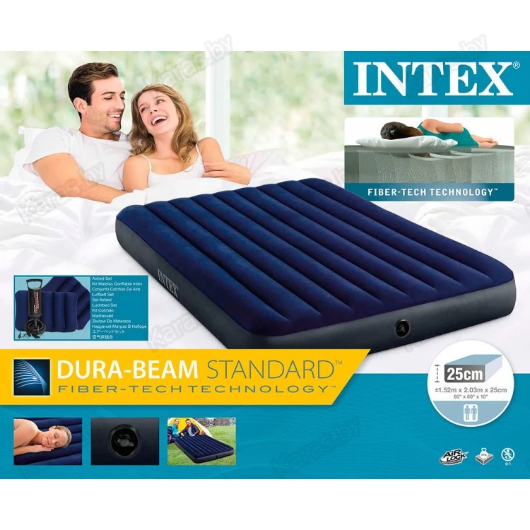 Надувной матрас серии Classic Downy Airbed Dura-Beam изготовлен по технологии Fiber-Tech. Внутренние перегородки сделаны из множества полиэфирных волокон, за счет чего он становится намного прочнее и легче. Благодаря новой технологии практически исключен разрыв внутренних перегородок, значительно выросла надежность и долговечность изделия. Флокированное покрытие матраса не даёт соскальзывать белью, и в то же время легко чистится. Клапан 2-в-1. Накачать матрас можно любым механическим или электрическим насосом Intex.