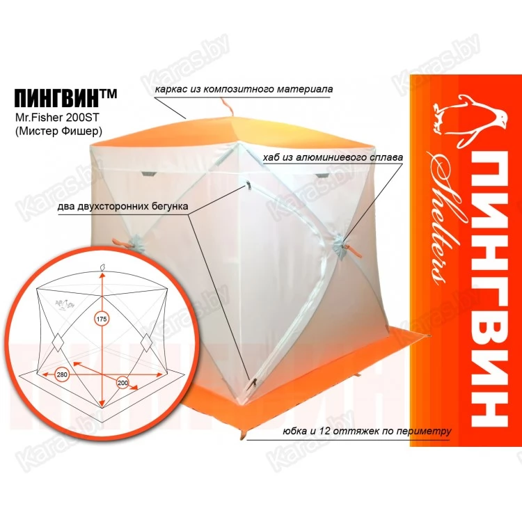 Палатка имеет форму куба, что позволяет рыбакам рационально использовать пространство. Сверлить лунки теперь можно прямо в установленной палатке. Габариты позволяют делать это без каких-либо неудобств. Благодаря своей конструкции палатка выдерживает порывистый ветер. Легко ставится в любую погоду одним человеком. В палатке могут свободно разместиться два человека и комфортно рыбачить как днем, так и ночью! Вход выполнен в угловом варианте и снабжен застежкой - липучкой, как на наружном, так и внутреннем тенте. Так же вход снабжен специальной зимней молнией, которая снаружи имеет защитную планку, предотвращающую от замерзания. Палатка выполнена в светлых тонах и имеет яркую крышу и пороги, а так же светоотражающие элементы по периметру, что позволяет увидеть палатку в ночное время. На наружной юбке имеются оттяжки для крепления порогов при отсутствии снега.