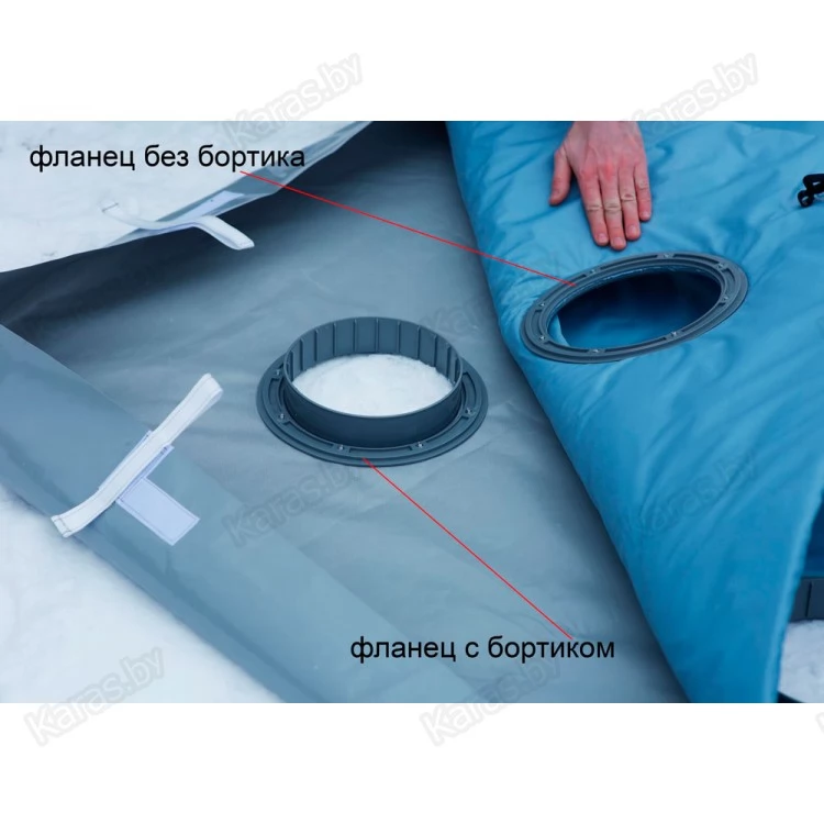 После установки палатки в гидро-теплоизоляционном дне края утепленного пола рекомендуется расположить поверх внутренней юбки палатки.