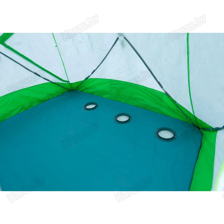 Палатка устанавливается внутрь гидро-термоизоляционного дна, и крепится к нему с внешней стороны тента петлями на "липучках". Основная внешняя юбка палатки укладывается в гидроизоляционном дне под внутреннюю юбку палатки. Края дна надежно защищены от внешних осадков защитной планкой (третьей юбкой), размещенной на стенках палатки, которая плотно фиксируется на бортах дна "липучками", исключая ее смещение ветровыми потоками.