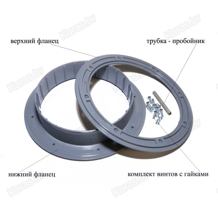 Фланцы представляют собой два литых диска из морозостойкого полипропилена с встречно смыкающимися плоскими поверхностями, на которых расположены кольцевые выступы, фиксирующие в сборе материал пола и надежно герметизирующие вырез под лунку. Нижний фланец имеет выступ, который образует кольцевой бортик с ребрами жесткости.