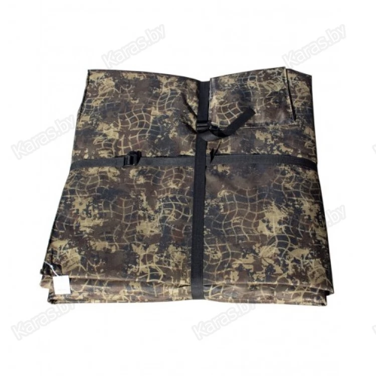 Теплый пол с четырьмя отверстиями под лунки, закрывающимися клапанами на липучке, по углам металлические люверсы для крепления ко льду. Пол складывается в квадрат, в сложенном виде фиксируется стропой.