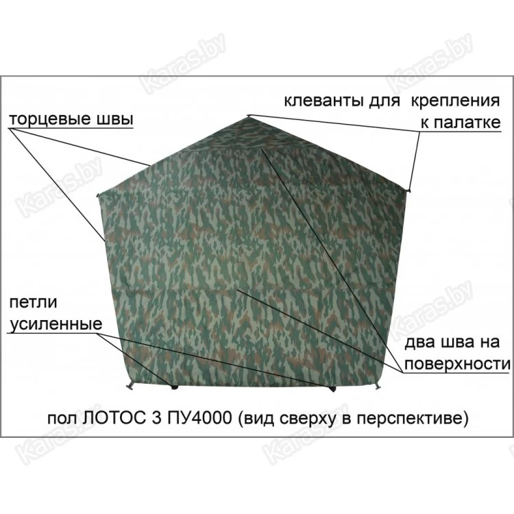 Пол утепленный «ЛОТОС 3 ПУ4000» предназначен для палаток собранных на стандартных каркасах «Лотос 3» и «Лотос 2». Пол имеет пятигранную форму и покрывает всю поверхность дна палатки.