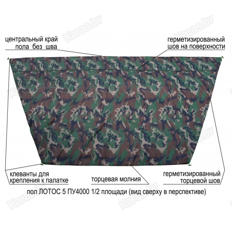 Пол утепленный «ЛОТОС 5 ПУ4000» предназначен для палаток собранных на стандартном каркасе «ЛОТОС 5». Пол имеет форму равнобедренной трапеции и покрывает половину поверхности дна палатки.