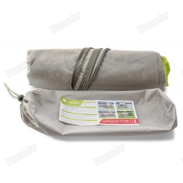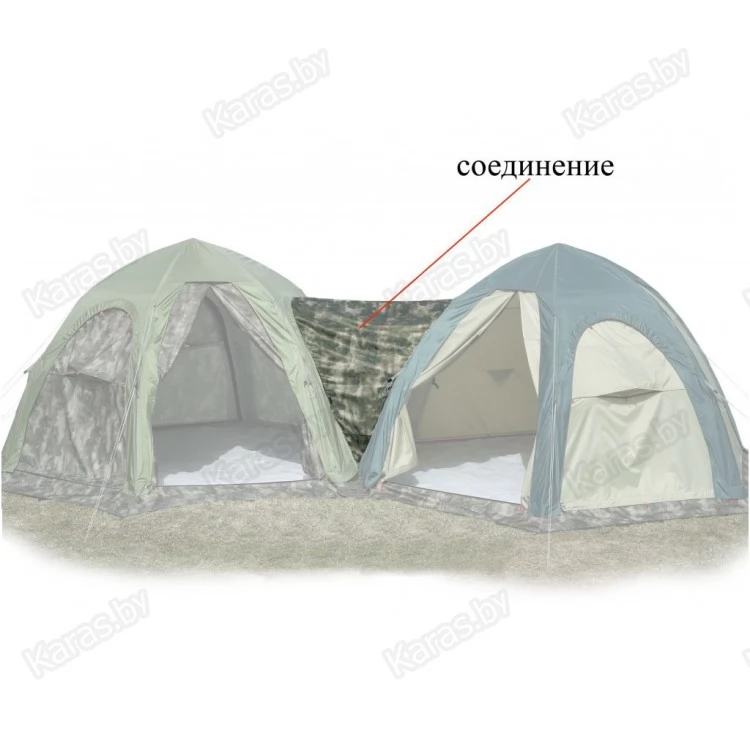 Соединение 5 на 5 (кмф, ПУ3000) предназначено для присоединения между собой двух модульных палаток собранных на каркасе «Лотос 5», у которых имеется унифицированный D-образный вход. Соединение крепится к установленной (раскрытой) палатке при помощи специальной тракторной молнии и к стенкам объединяемых палаток и хорошо защищает проход между палатками от осадков и ветра.