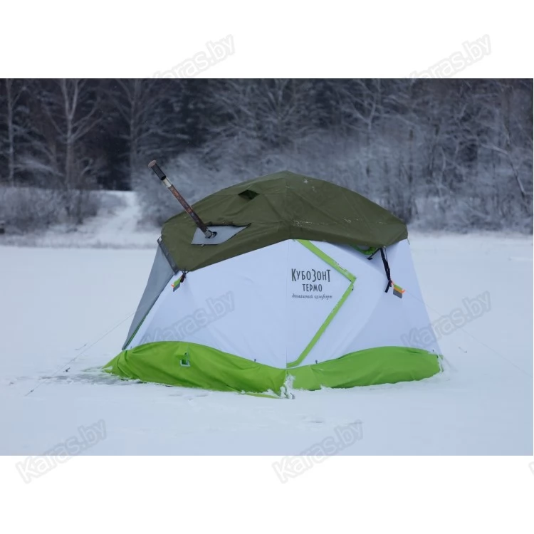 Защита утепленной палатки от дождя обеспечивается при помощи Влагозащитного колпака ЛОТОС КубоЗонт 4, который крепится на куполе палатки. Влагозащитный колпак выполнен из прочной высококачественной ткани полиэстер Оксфорд 300Д (плотность 140 г/м2) водостойкостью не менее 10 000 мм вод. столба. Швы колпака проклеены герметизирующей лентой.