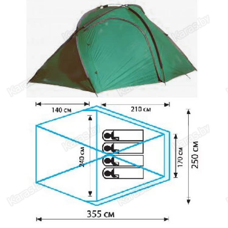 Ветроустойчивая 4-х местная кемпинговая (семейная) двухслойная палатка с двумя входами. Все швы проклеены. Палатка предназначена для семейного отдыха в весеннее, летнее и осеннее время.