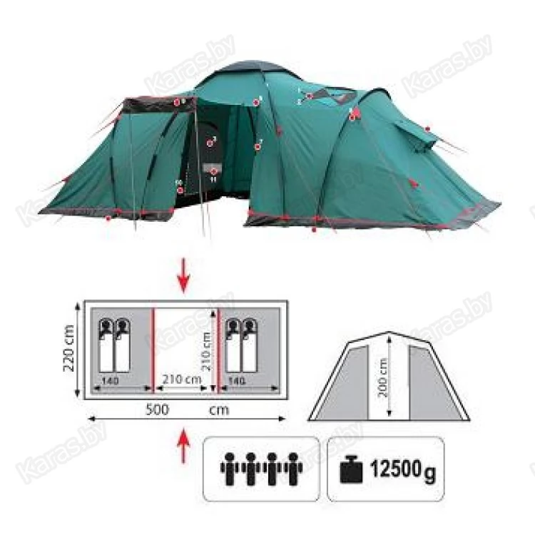 4-х местная кемпинговая (семейная) двухслойная палатка с двумя входами, большим и высоким фойе. Все швы проклеены. Палатка идеальна для семейного отдыха в весеннее, летнее и осеннее время.