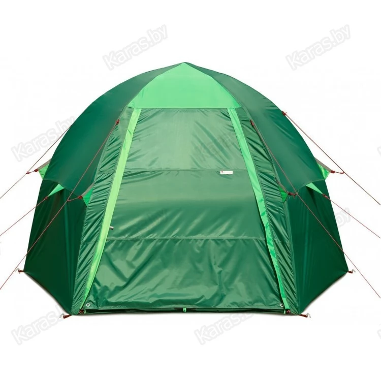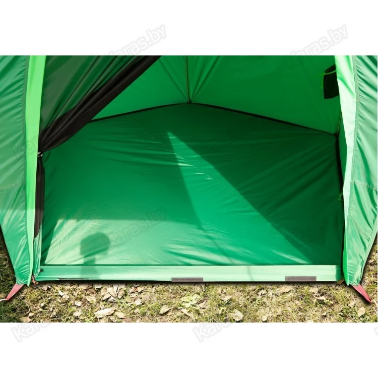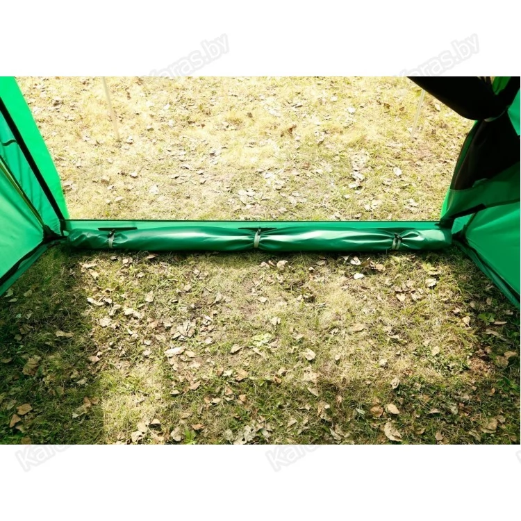 Вход в палатку выполнен в виде широкого П-образного дверного проема, который дублируется противомоскитной сеткой. В нижней части дверного полотна встроены усиленные крепления (люверсы) для установки стоек (опция, стойки приобретаются отдельно), что позволяет формировать высокий защитный козырек над входом.