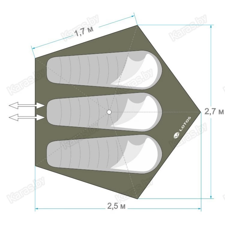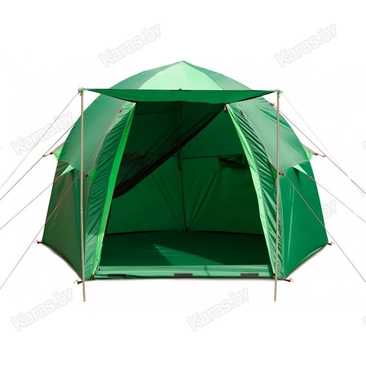 Летняя палатка ЛОТОС 3 Саммер – это пятигранный купол зонтичного типа раскрытия. Тент и каркас образуют единую цельную конструкцию, благодаря чему, при раскрытии, палатка сразу же принимает окончательную жесткую и устойчивую форму, без каких-либо дополнительных механизмов и креплений.