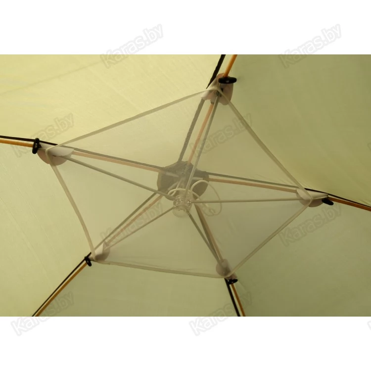 Каркас палатки, собранный из стеклокомпозитной арматуры диаметром 9 мм со стальными шарнирными узлами (скобы и хомуты), имеет огромный запас прочности, практически исключающий возможные поломки даже при неправильном раскрытии палатки, или при экстремальных погодных условиях. Силовые крепления, прочный каркас и обтекаемая купольная форма укрытия позволяют палатке надежно выдерживать высокие ветровые нагрузки, вплоть до штормовых.