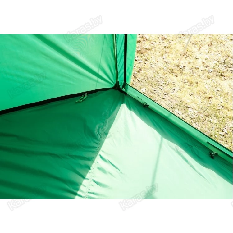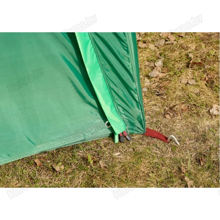 Туристическая палатка ЛОТОС 3 Саммер в базовой комплектации оснащена встроенным герметичным дном, которое, в собранном виде, крепится на клевантах к порогу входа.