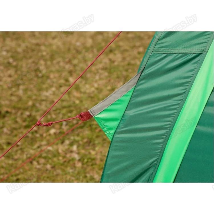 Кемпинговая палатка ЛОТОС 3 Саммер оснащена 19-ю усиленными креплениями, где 5 креплений расположены по нижним углам для фиксации палатки колышками к грунту, 10 креплений для растяжек размещены на дугах каркаса и 4 на стенках палатки.