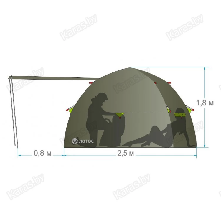 Размеры укрытия позволяют установить в нем кемпинговую мебель (стол со стульями), а также разместить до трех спальных мест.