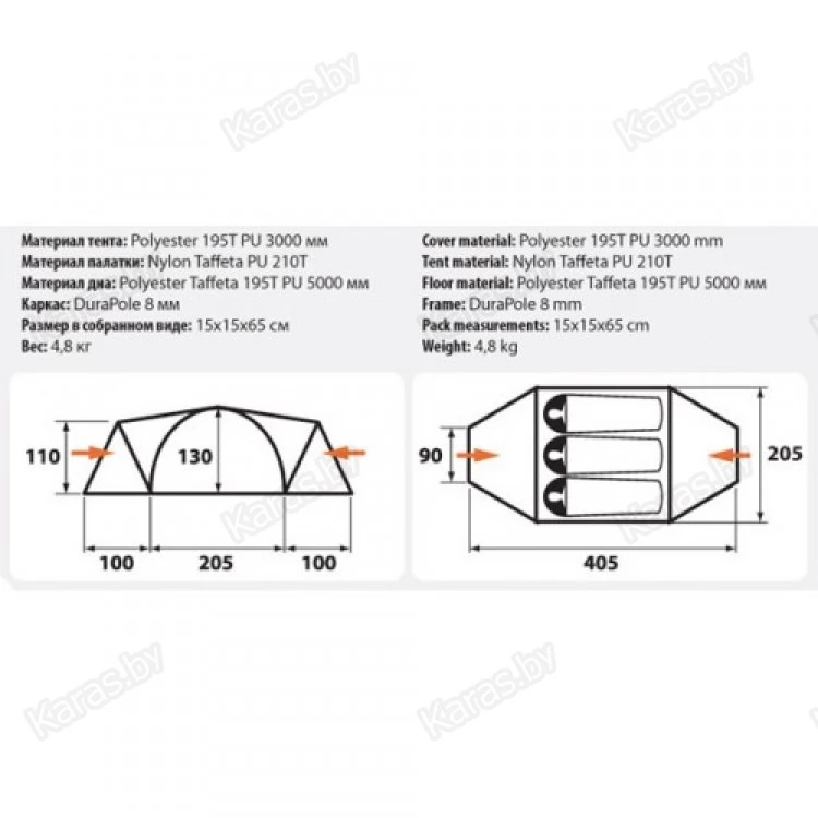 Pamir 3 Plus - универсальная трехместная палатка для туризма, рыбалки, охоты и активного отдыха. Просторная и функциональная, обладает относительно небольшим весом и размером в собранном виде, может с одинаковым успехом использоваться в дальних походах и туристических выездах. Палатка имеет два больших тамбура и два входа, которые продублированы противомоскитной сеткой. Предусмотрены вентиляционные окна, карманы на стенках палатки, под куполом имеется подвесная полочка.