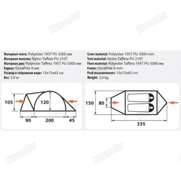 Универсальная двухместная палатка для туризма, рыбалки, охоты и активного отдыха. Просторная и функциональная, обладает небольшим весом и размером в собранном виде, может использоваться в дальних походах и туристических выездах. Палатка имеет один большой тамбур и два входа, которые продублированы противомоскитной сеткой. Предусмотрены вентиляционные окна, карманы на стенках палатки, под куполом имеется подвесная полочка.