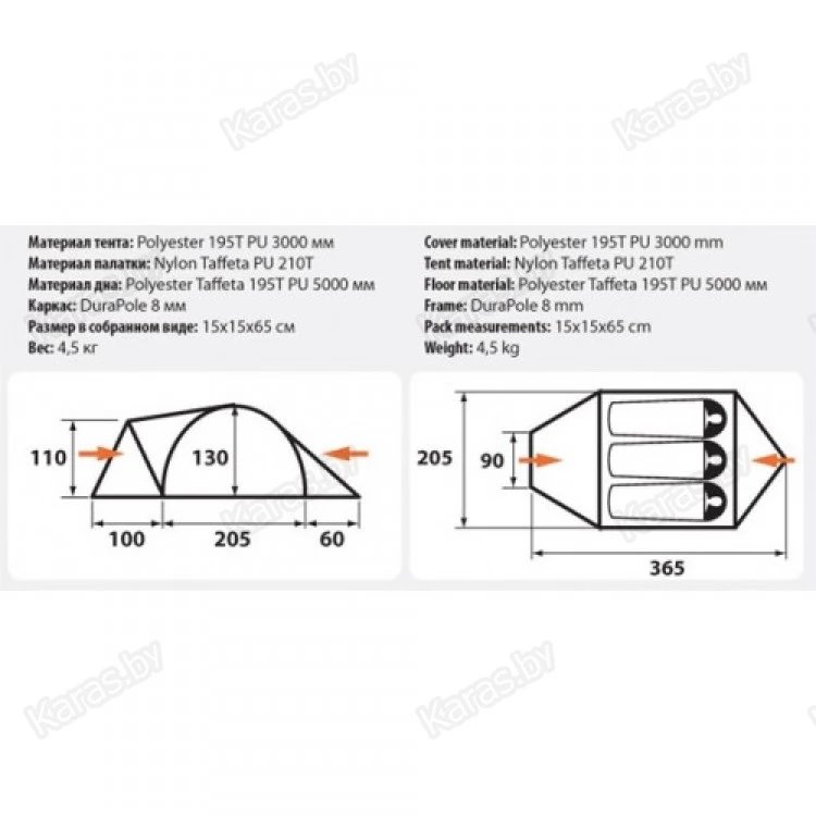 Универсальная трехместная палатка для туризма, рыбалки, охоты и активного отдыха. Просторная и функциональная, обладает небольшим весом и размером в собранном виде, может использоваться в дальних походах и туристических выездах. Палатка имеет один большой тамбур и два входа, которые продублированы противомоскитной сеткой. Предусмотрены вентиляционные окна, карманы на стенках палатки, под куполом имеется подвесная полочка.
