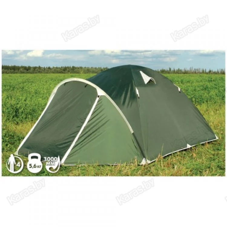 Универсальная 4-х местная палатка для туризма, рыбалки, охоты и активного отдыха. Просторная и функциональная, обладает небольшим весом и размером в собранном виде, может использоваться в дальних походах и туристических выездах. Палатка имеет один большой тамбур и два входа, которые продублированы противомоскитной сеткой. Предусмотрены вентиляционные окна, карманы на стенках палатки, под куполом имеется подвесная полочка.