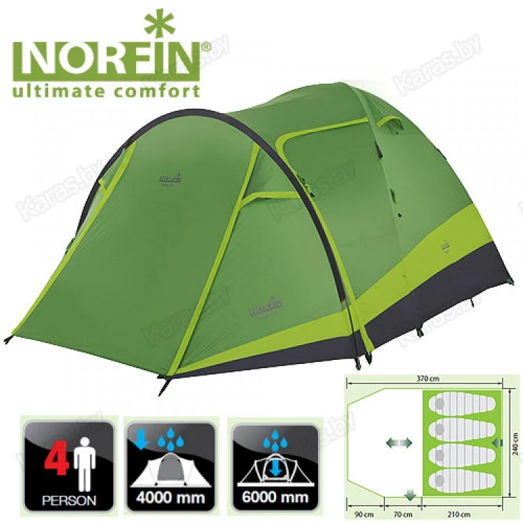 Палатка NORFIN Rudd 3+1 – Одна из наиболее комфортных палаток в треккинговой группе. Три входа, просторный тамбур для небольшой кухни, рюкзаков, велосипеда, в тамбуре есть возможность повесить веревки для сушки белья. Рыбаки смогут разместить в ней у водоема всю свою семью.