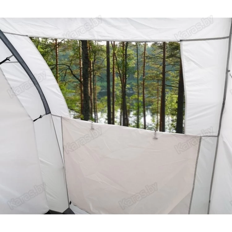 Швы надёжно герметизированы. Пропитка, задерживающая распространение огня. Вместительный тамбур для хранения снаряжения или обустройства походной кухни. Штормовые оттяжки прошиты светоотражающей нитью.