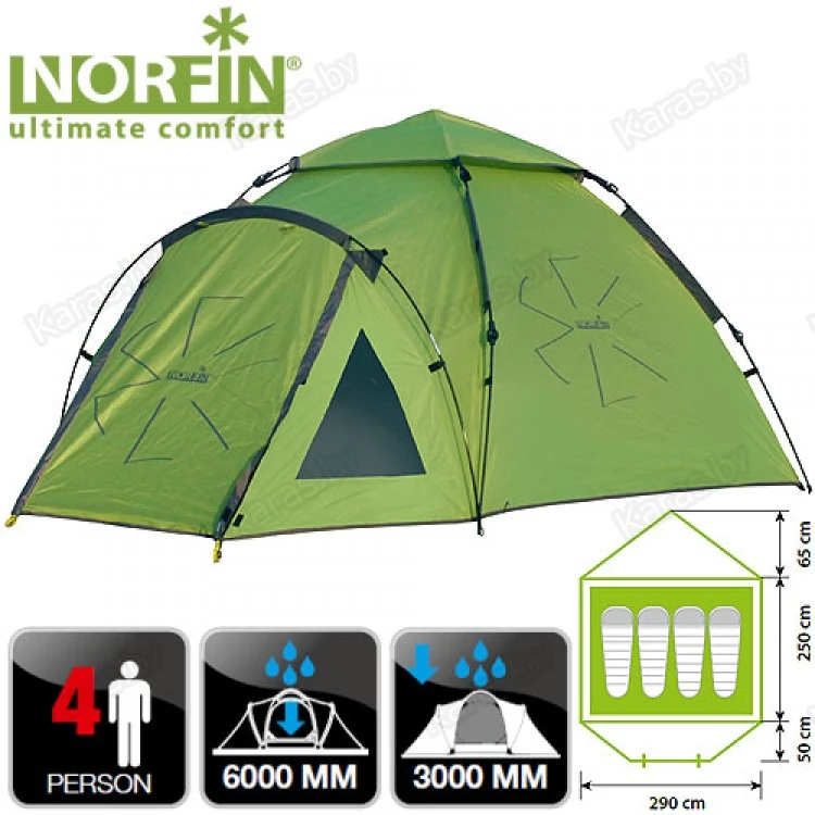 NORFIN Hake 4 - Двухслойная 4-х местная палатка с полуавтоматическим быстро сборным каркасом. Два компактных тамбур на входах в палатку. Внутренняя палатка и тент устанавливаются одновременно. Установка палатки может быть совершена одним человеком за считанные секунды.