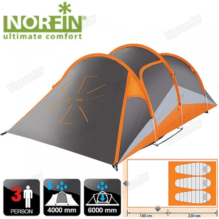 Палатка NORFIN Helin 3 Alu – Палатка тунельного типа “”полубочка”" обеспечивает максимально эффективное использование внутреннего пространства. Размер тамбура один из самых вместительных среди треккинговых палаток. При этом облегченная алюминиевая конструкция каркаса, пол в палатке и в тамбуре из облегченного и прочного Oxford сохраняют оптимальный вес при максимальном комфорте. Купить палатку летнюю вам предлагает магазин снаряжения для рыбалки и отдыха на природе karas.by.