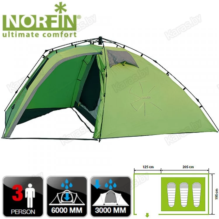 NORFIN Peled 3 - Двухслойная 3-х местная палатка с полуавтоматическим быстро сборным каркасом. Просторный тамбур на входе в палатку. Внутренняя палатка и тент устанавливаются одновременно. Установка палатки может быть совершена одним человеком за считанные секунды.