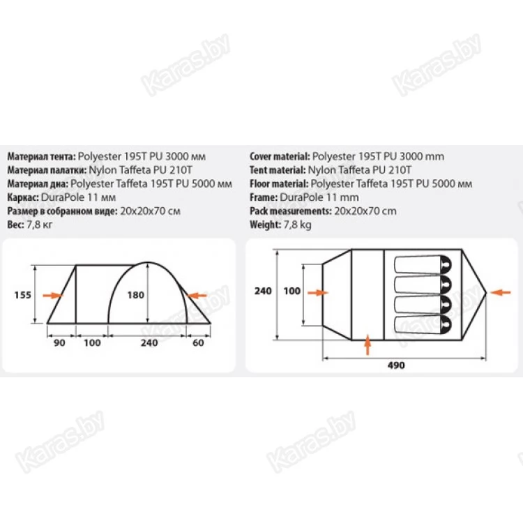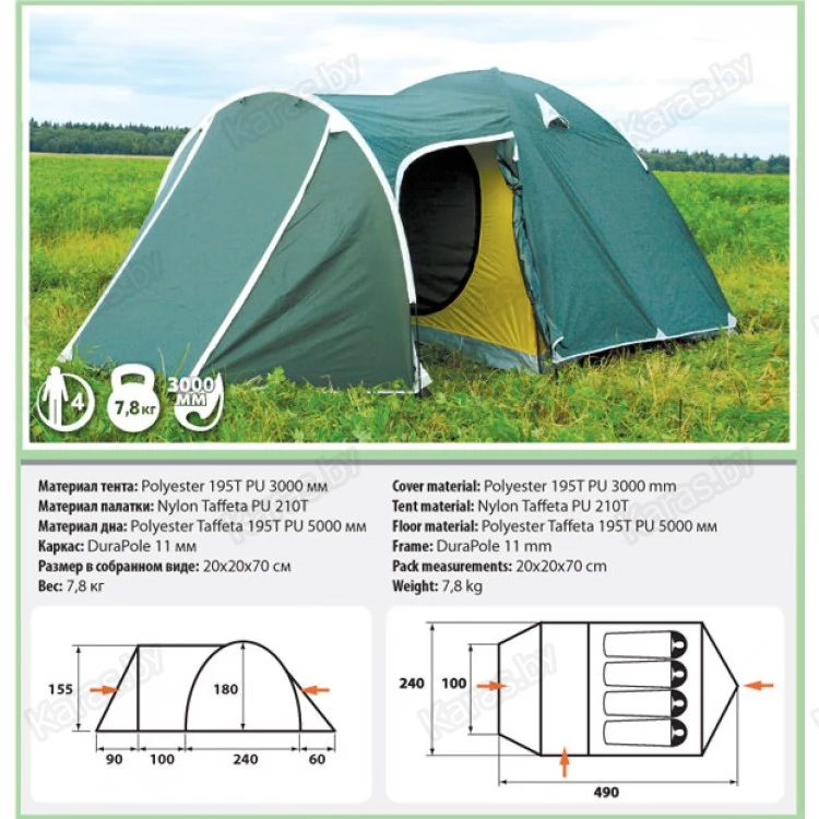 Trial 4 Plus – вместительная палатка для тех, кто любит отдыхать на природе с комфортом. Не смотря на свои внушительные размеры и высоту, быстро собирается и разбирается. Вместительный тамбур с двумя раздельными входами позволяют использовать его как летнюю кухню. Отдельный вход в жилое помещение. Все входы продублированы противомоскитной сеткой. Предусмотрены вентиляционные окна, карманы на стенках палатки, под куполом имеется подвесная полочка. Особенности: хорошо вентилируется, большой внутренний объем, вместительный тамбур, три входа, дуги увеличенного диаметра.
