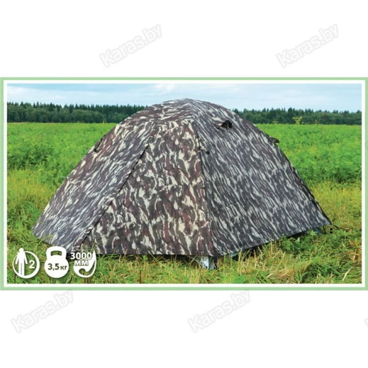Туристическая 2- местная палатка. Два входа. Легкость и быстрота сборки-разборки палатки, компактность и малый вес. Входы продублированы противомоскитной сеткой. Предусмотрены вентиляционные окна, карманы на стенках палатки, под куполом имеется подвесная полочка