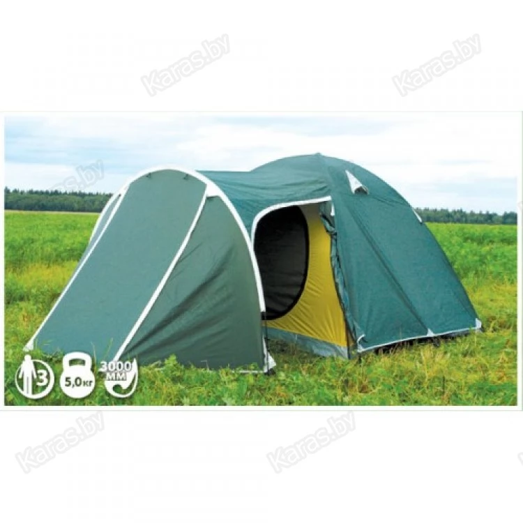 Универсальная 3-х местная палатка. Просторная и функциональная, обладает относительно небольшим весом и размером в собранном виде, может использоваться в дальних походах и туристических выездах. Вместительный тамбур с двумя раздельными входами. Все входы продублированы противомоскитной сеткой. Предусмотрены вентиляционные окна, карманы на стенках палатки, под куполом имеется подвесная полочка.