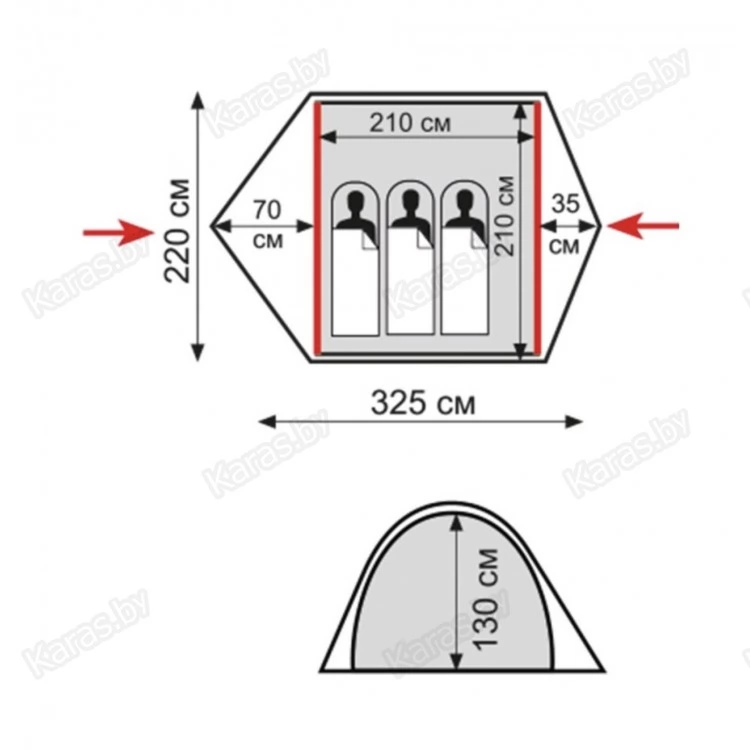 - Двухслойная палатка с двумя входами и двумя тамбурами.