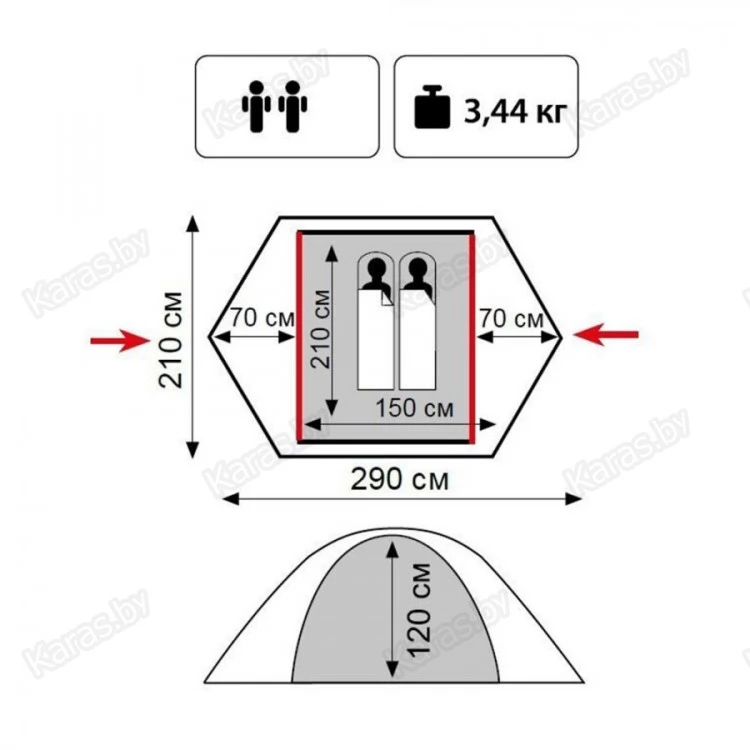 Полностью дышащий материал. Входы D-образные, на двухзамковых молниях, их можно открывать и закрывать с занятыми руками. Оба входа продублированы москитной сеткой.
