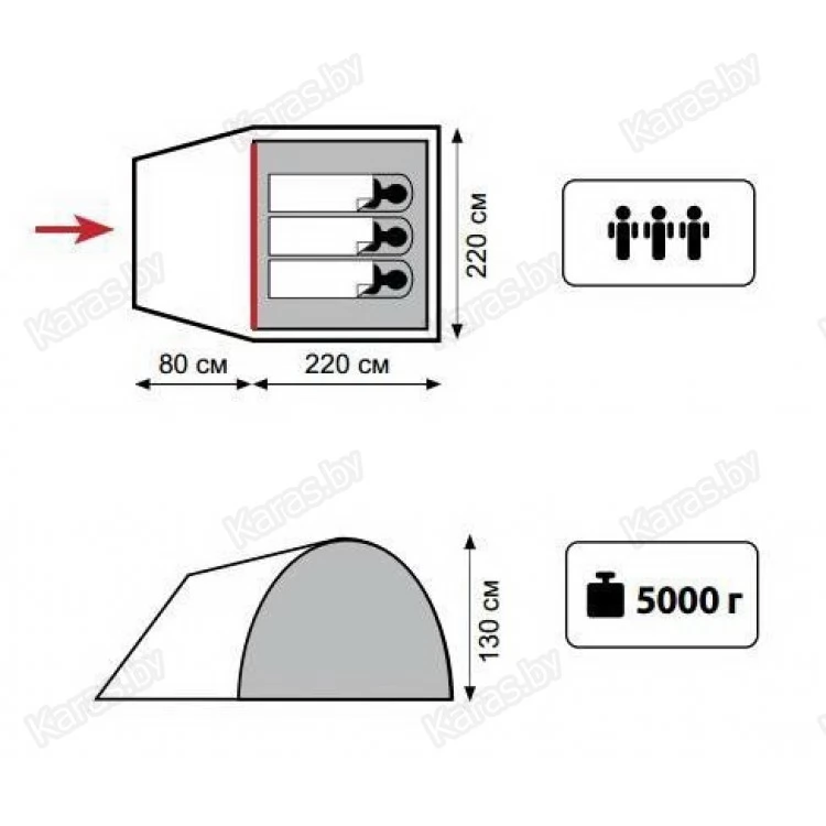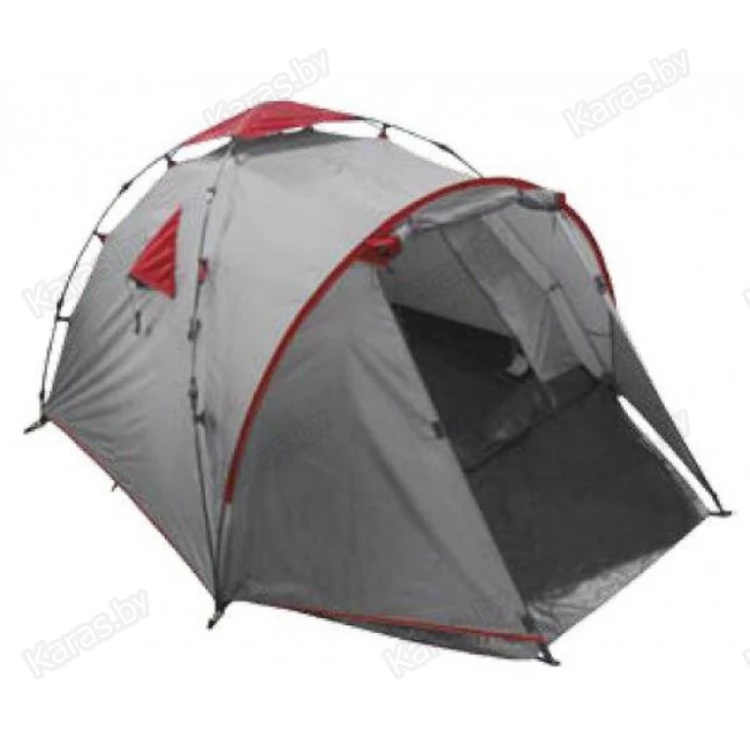Трехместная туристическая палатка-купол с тамбуром. Быстро собирается и разбирается, может быть установлена без растяжек. На тенте есть два складных вентиляционных окна. Тент обработан противопожарной пропиткой и составом, который поглощает ультрафиолетовые лучи. Все швы тента проклеены. Растяжки палатки обладают светоотражающими свойствами, чтобы о них случайно не споткнуться ночью. Внутренняя палатка имеет карманы для мелочей, в том числе подвесной карман под потолком с петлей для фонарика. Вход во внутреннюю палатку двойной, с противомоскитной сеткой. В комплект входит тент, внутренняя палатка, набор дуг и колышков, сумка-переноска с ручками, ремнабор.