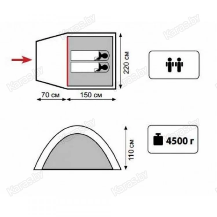 Двухместная туристическая палатка-купол с тамбуром. Быстро собирается и разбирается, может быть установлена без растяжек. На тенте есть два складных вентиляционных окна. Тент обработан противопожарной ропиткой и составом, который поглощает ультрафиолетовые лучи. Все швы тента проклеены. Растяжки палатки обладают светоотражающими свойствами, чтобы о них случайно не споткнуться ночью. Внутренняя палатка имеет карманы для мелочей, в том числе подвесной карман под потолком с петлей для фонарика. Вход во внутреннюю палатку двойной, с противомоскитной сеткой. В комплект входит тент, внутренняя палатка, набор дуг и колышков, сумка-переноска с ручками, ремнабор.