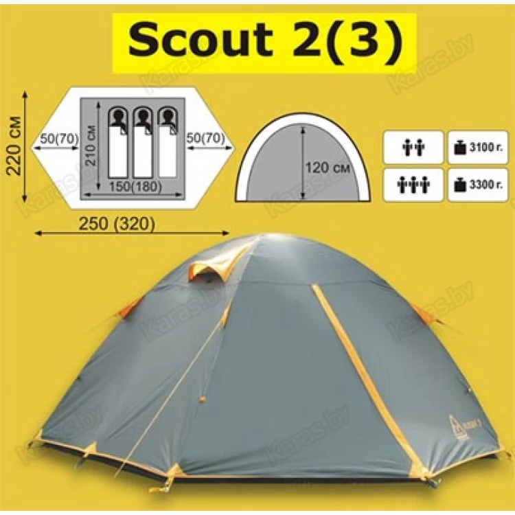 Универсальная двухслойная туристическая палатка-полусфера с двумя входами и двумя тамбурами. 2 вентиляционных клапана. Все швы проклеены. Палатка идеальна для туристических походов в весеннее, летнее и осеннее время.