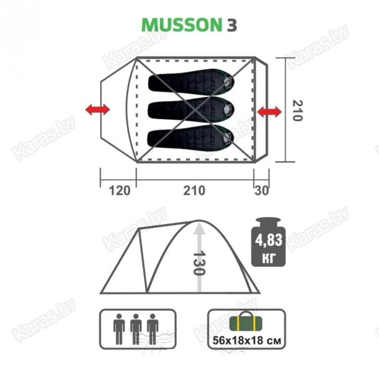 Палатка MUSSON 3 Helios - удобная 3-местная палатка с вместительным тамбуром, сформированным отдельной дугой.