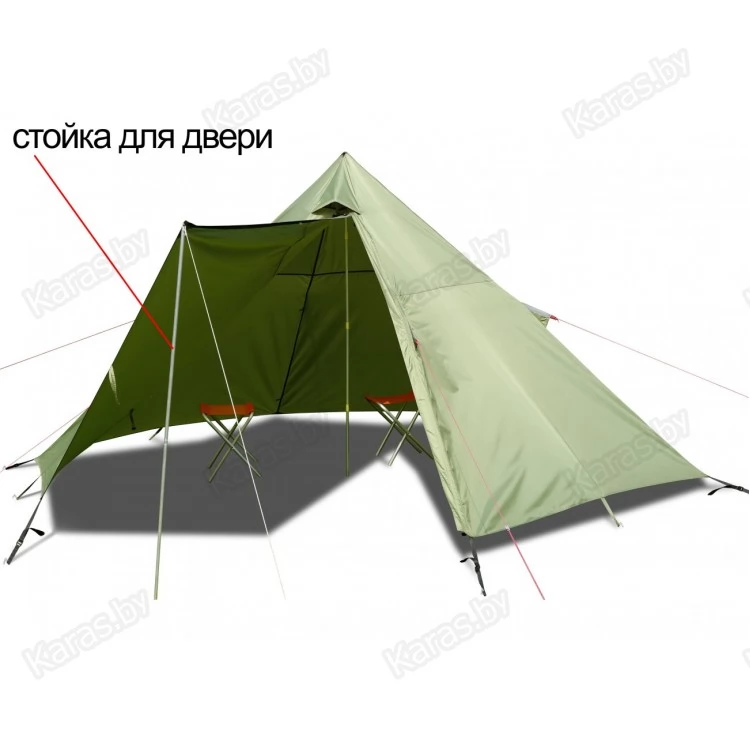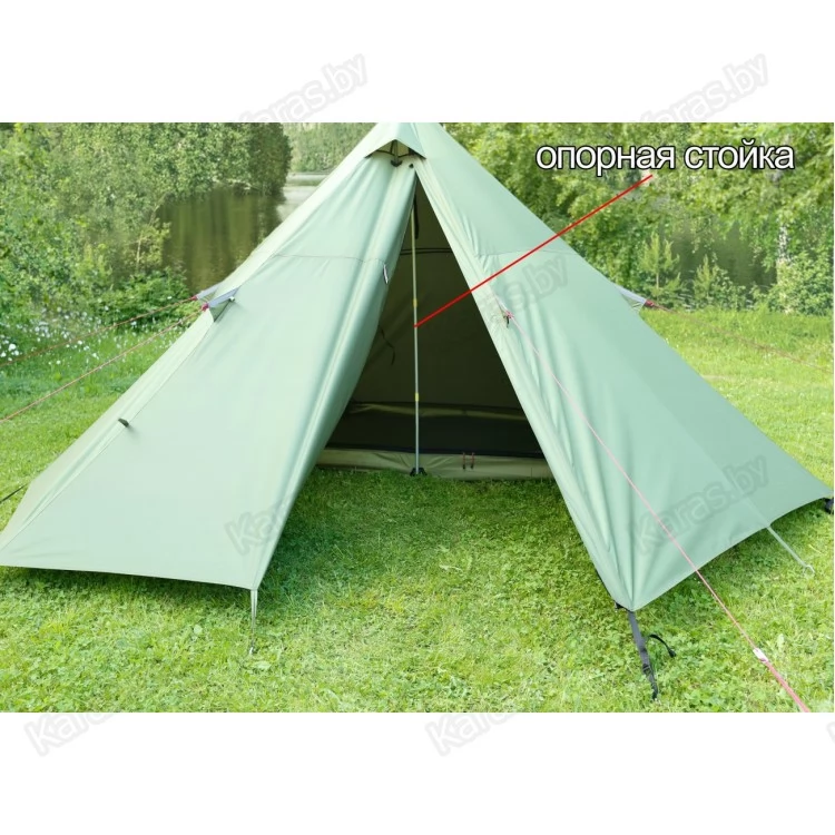 При установке палатки используется регулируемая опорная стойка (188 см), которая входит в базовую комплектацию. Стойка устанавливается внутри по центру палатки и обеспечивает жесткую опору для макушки палатки. В верхней части опорной стойки установлен винт для точной регулировки длины стойки в диапазоне +-3 см.