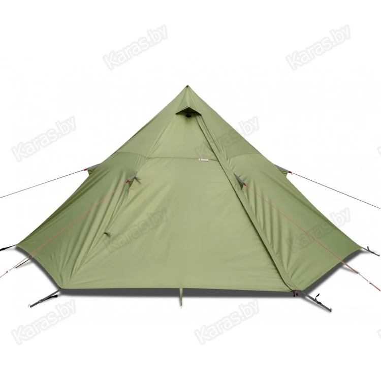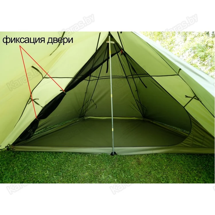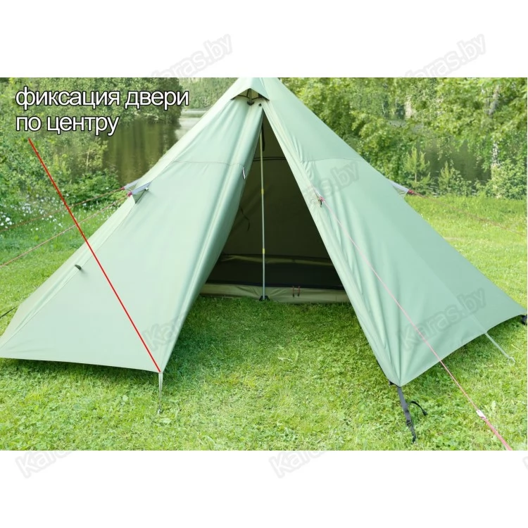 Внешняя палатка оснащена одним дверным проемом, который раскрывается во всю ширину ее стенки и обеспечивает укрытию удобный широкий вход и хорошую вентиляцию. В раскрытом состоянии дверная створка может быть зафиксирована опорной стойкой (опция, приобретается отдельно), формируя над входом удобный козырек от осадков и солнца.