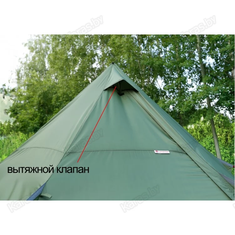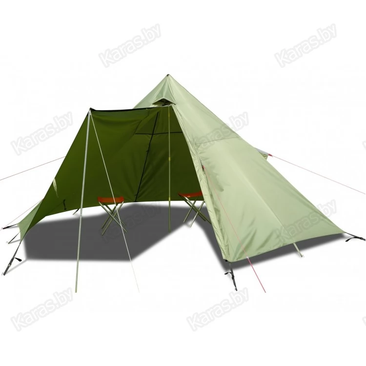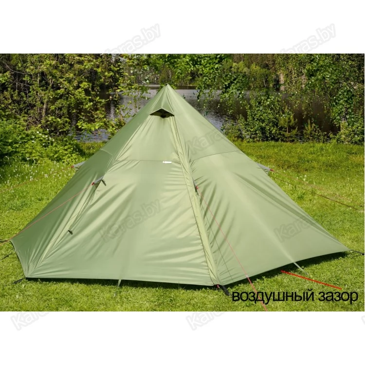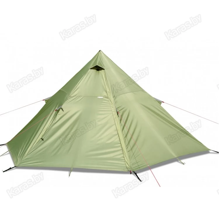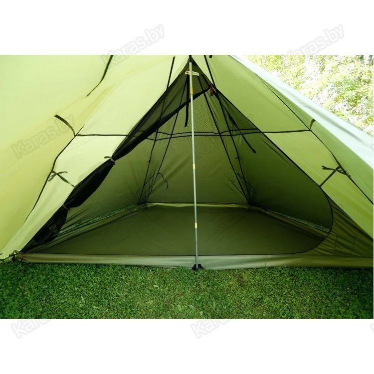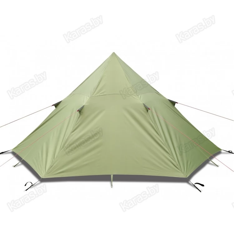 Укрытие делится на две части – тамбур и спальная капсула. Высота центральной части палатки позволяет пользователям вставать в полный рост как в зоне тамбура, так и в спальной комнате. При максимальном комфорте расположения туристов размер укрытия рассчитан на двух человек. Но, при необходимости, большая внутренняя площадь позволит разместить под куполом палатки до шести человек. Отдельный просторный тамбур может рационально использоваться для размещения объемного снаряжения и животных, сопровождающих туристов на отдыхе.