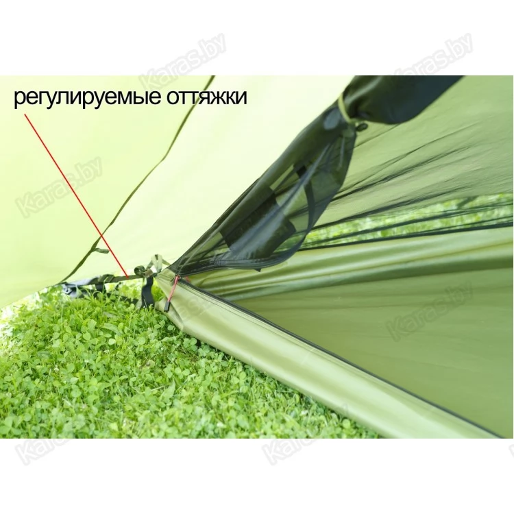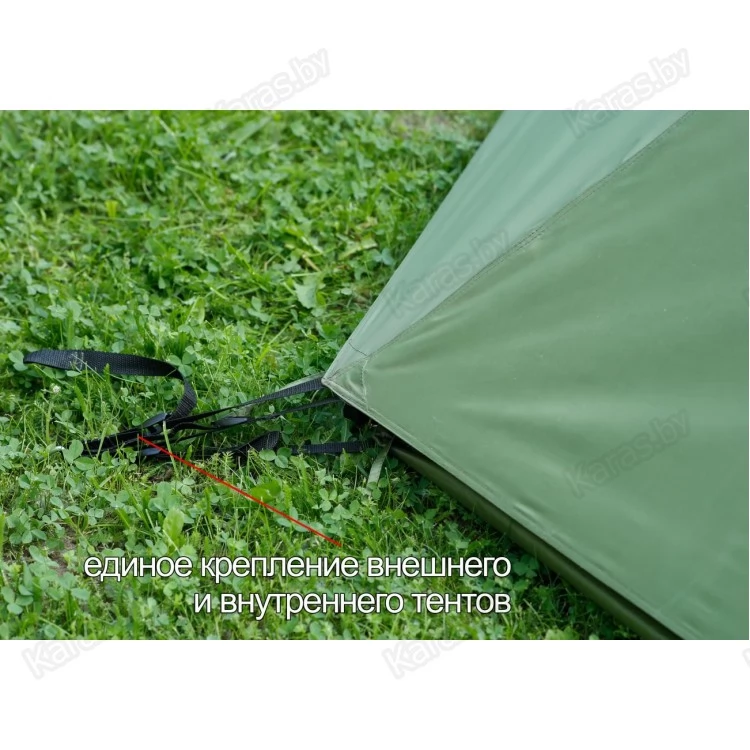 По нижнему периметру тента внешней палатки встроены 12 креплений к грунту, шесть из которых расположены по углам шестигранника и выполнены в виде усиленных регулируемых оттяжек, рассчитанных на большие ветровые нагрузки. Другие шесть нижних не регулируемых креплений расположены по центру каждой стенки. На ребрах тента внешней палатки встроены шесть усиленных креплений для шнуров-оттяжек, оснащенных кармашками для их укладки и рассчитанных на большие ветровые нагрузки.