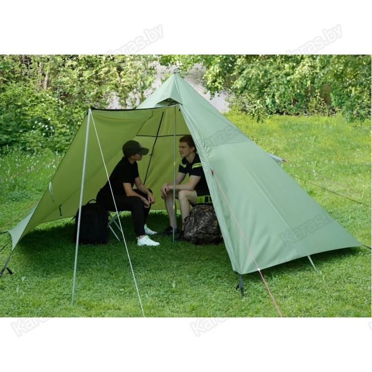 Внешняя палатка выполняет функцию надежного навеса для защиты укрытия от осадков, ветра и солнца. Нижний периметр внешней палатки не оснащен юбкой. При установке палатки на грунте, между почвой и тентом внешней палатки сохраняется воздушный зазор около 10 см, который обеспечивает укрытию хорошую вентиляцию в жаркую погоду. Тент внешней палатки пошит из прочной ткани полиэстер Оксфорд 210Д (плотность 100 г/м2) водостойкостью не менее 4 000 мм вод. столба. Швы тента проварены изнутри герметизирующей лентой.
