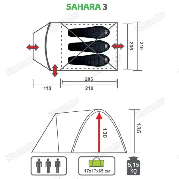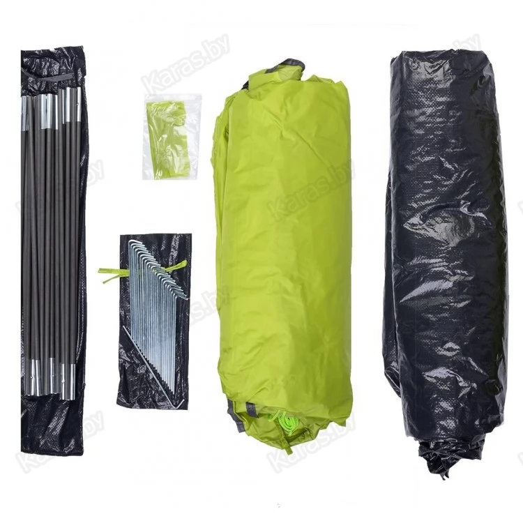 Размеры внешнего тента: (110+210) х 210 х 135 см. Тент изготовлен из полиэстера (polyester 190T) и имеет специальную пропитку, которая придает ему прочность и долговечность, а также защищает от выгорания и преждевременного износа. Водоотталкивающее покрытие тента (PU) – 3000мм. Швы тента проклеены.