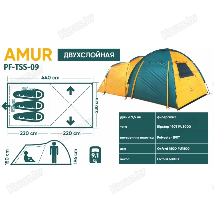Трехместная кемпинговая палатка «Следопыт Amur» - идеально подойдет для путешествий и комфортного отдыха на природе. Имеет 3 входа. Палатка делится на две части: просторный тамбур (для хранения вещей, установки столика и стульев и пр.) и просторный спальный отсек, который имеет выходы наружу и в тамбур. Тамбур оборудован двумя зеркальными входами, увеличенным прозрачным окном с внешней шторкой и пристегивающимся полом. Высота в купольной части тамбура составляет 196 см позволяет стоять в полный рост. Палатка оснащена двумя вентиляционными окнами в спальной зоне, а также системой вентиляции купола, с защитой от дождя. Входы во внутреннюю палатку и вентиляционные окна имеют антимоскитную сетку. Боковые двери могут использоваться как тент. Благодаря эффективным светоотражающим элементам, палатка хорошо видна издалека в темноте, даже при слабом освещении фонаря. Палатка обладает яркой окраской, которая практически не выгорает со временем, что делает ее легко заметной даже в густом лесу.