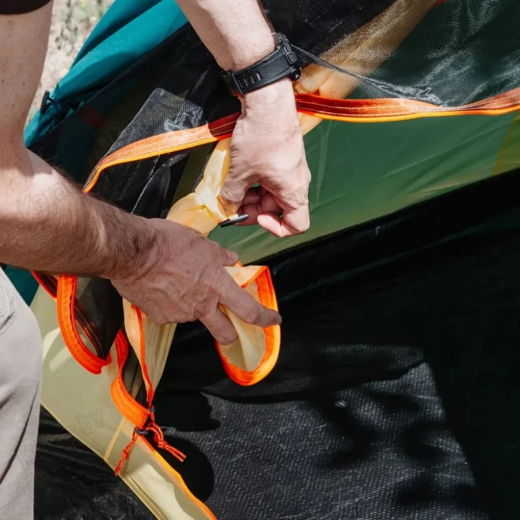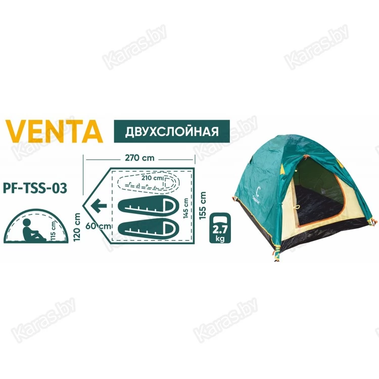 Палатка туристическая «Следопыт – Venta» - бюджетная треккинговая двуслойная палатка с легким и быстры способом сборки и установки. Модель имеет небольшой тамбур, а также два вентиляционных клапана. Внутренний слой изготовлен из «дышащего полиэстера», благодаря чему в палатке сохраняется комфортный температурный режим. Для защиты от насекомых на входе предусмотрена противомоскитная сетка. Места крепления оттяжек имеют усиление, а веревки оттяжек сделаны из паракордового шнура со светоотражающей нитью. Сумка - чехол выполнена цветом и из ткани основного внешнего тента с вертикальной и горизонтальной ручками для переноски, благодаря этому она имеет презентабельный внешний вид.