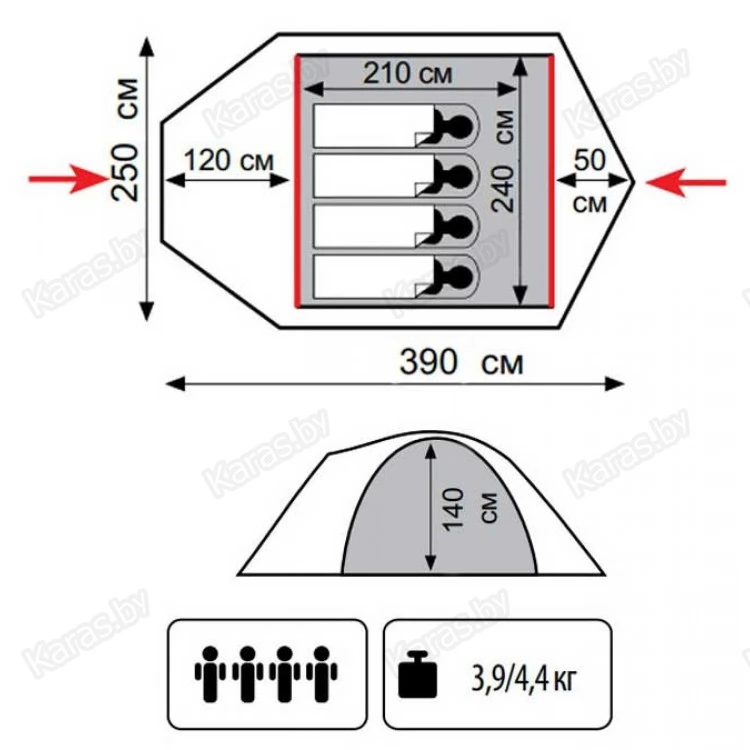 Тент: 100% Полиэстер 75D/190T WR PU 4000 мм в.ст.
